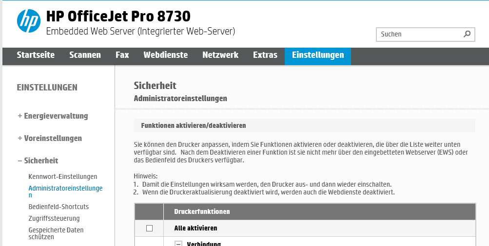 Ganz unten bei dieser Liste von Druckerfunktionen gab es den Punkt Druckeraktualisierungen. Hier konnte ich Alle Firmware-Aktualisierungen aktivieren.