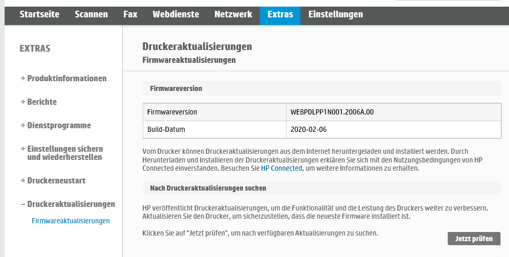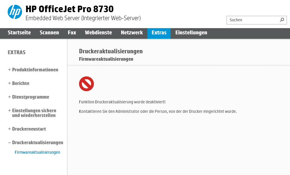 Da dieses Tool nicht funktioniert hat, habe ich mich dazu entschieden, die Firmware über das Webinterface zu aktualisieren oder zumindest zu schauen ob das möglich ist. Auf dem Webinterface, im Menupunkt Extras, der Kategorie Druckeraktualisierungen gab es den Punkt Firmwareaktualisierungen. Doch als ich diesen Punkt aufrief, erschien die Meldung, dass diese Funktion deaktiviert wurde.